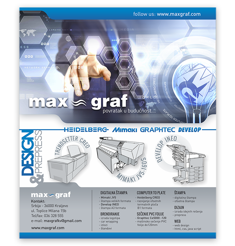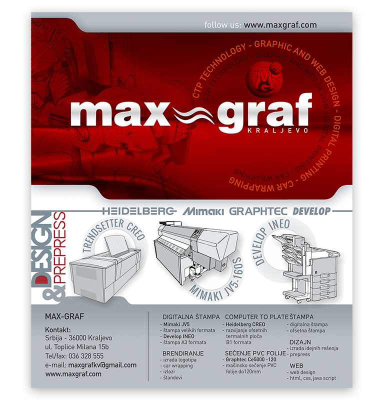 • Od samog osnivanja MAXGRAF-a primarne delatnosti našeg preduzeća su desktop dizajn i grafička priprema za ofset, sito, flexo, digitalnu i sve ostale vidove štampe. U periodu od 1999. godine sve do današnjeg dana izradili smo preko 10000 različitih grafičkih solucija za potrebe naših klijenata. Na ovoj stranici možete pronaći pokazne i demo modele logotipa kao i neka od naših idejno-tehničkih rešenja.